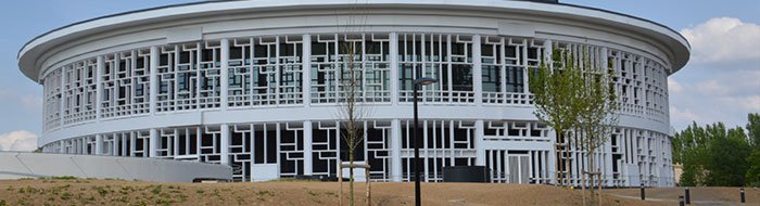 A modern building with a large emblem at the top is visible; it features gray, red, and blue tones. In front of the building, there is a row of parked cars and some greenery, with a lawn in the foreground. The building has a slogan about innovation visible on its facade.